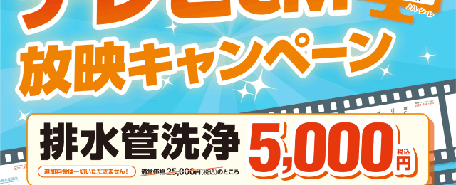 平素より当社サービスをご利用いただき、心より感謝申し上げます。この度より多くの方に当社を知っていただくため、排水管洗浄サービスに関する テレビCMを放映いたします。 放映に伴いまして、日頃の感謝を込めて 「CM放映記念キャンペーン」 を実施いたします!! ■ キャンペーン内容 …